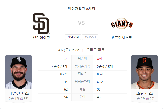 4월 6일 MLB 믈브 샌디에이고 파드리스 VS 샌프란시스코 자이언츠 경기 예측