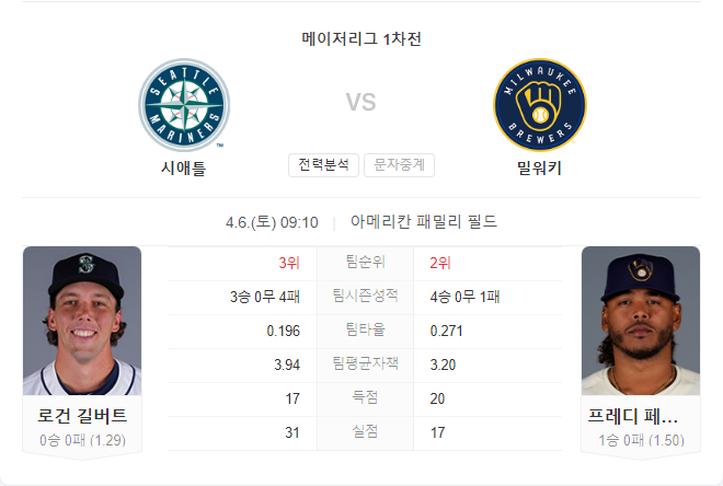 4월 6일 MLB 믈브 시애틀 매리너스 VS 밀워키 브루어스 경기 예측