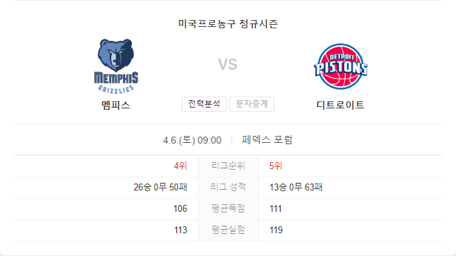 4월 6일 NBA 디트로이트 피스톤즈 VS 멤피스 그리즐리스 경기 예측