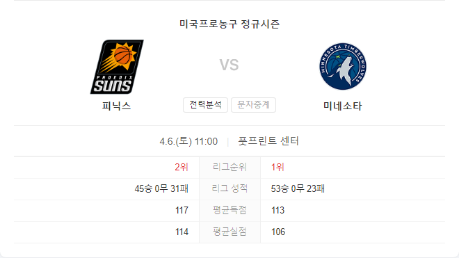 칼-앤써니 타운스가 건강하고 경기에 출전할 수 있다면 파워 균형이 크게 달라질 수 있었을 것입니다. 이 상황에서 피닉스 선즈가 우위를 점하는 것이 분명해 보입니다. 선즈는 상위 6위 안에 들기 위해 싸우고 있으며, 그들에게는 플레이오프가 사실상 이미 시작된 셈입니다. 게임 대부분을 통제하며 쉽게 승리를 확보할 것으로 기대합니다.