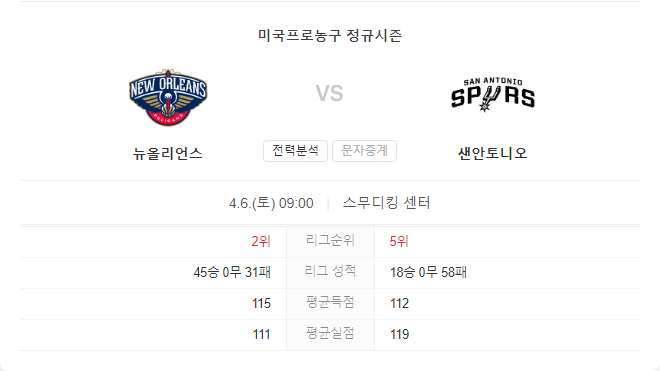 샌안토니오 스퍼스는 재건 과정에 있으며, 빅터 웸반야마를 중심으로 팀의 미래를 구축하고 있습니다. 반면, 뉴올리언스 펠리컨즈는 플레이오프에 참여하려 하지만 최근 부상과 경기력 저하로 어려움을 겪고 있습니다.