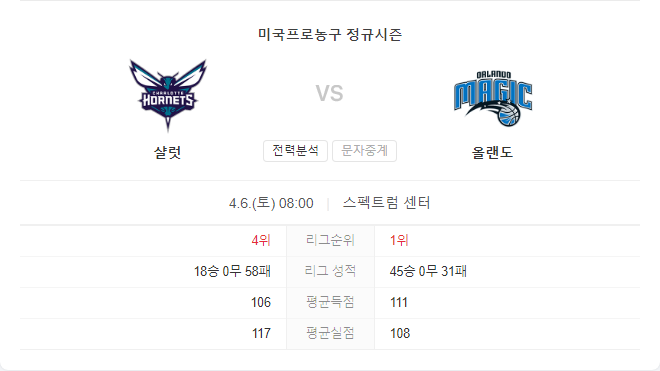 파올로 반케로와 프란츠 바그너가 이끄는 올랜도 매직의 공격력과 안정적인 수비력을 바탕으로 샬럿 호넷츠를 상대로 승리를 거둘 것으로 예상됩니다.