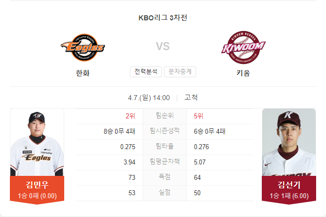 키움 히어로즈는 연승 행진을 이어가기 위해 김선기 투수를 선발로 마운드에 올립니다. 김선기는 2일 삼성 원정에서 5이닝 1실점으로 팀의 승리를 이끌었으며, 상대 레벨에 맞는 투구를 보여주고 있습니다. 그러나 한화와 같은 상승세에 있는 팀을 상대로는 고전할 수 있다는 전망이 있습니다.