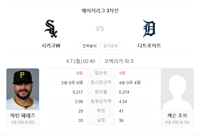 현재 3승 4패로 AL 중부지구 중위권에 자리하고 있으며, 시즌 초반을 무난하게 소화 중입니다. 선발 잭슨 조브는 이번 시즌 첫 등판에서 4이닝 3실점(2피홈런, 4볼넷)으로 다소 불안한 모습을 보였지만, 잠재력은 높은 유망주입니다. 디트로이트 역시 부상자 명단은 없습니다.