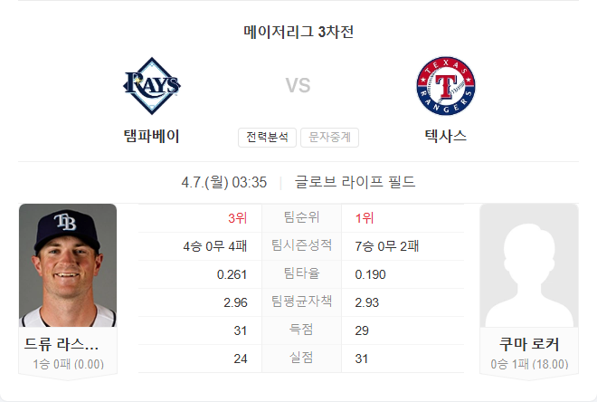 4월 7일 MLB 메이저리그 탬파베이 레이스 VS 텍사스 레인저스 타카짱의 경기 예측 분석