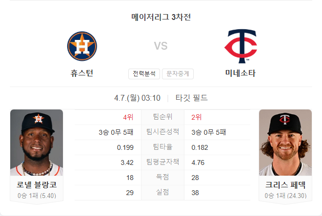 4월 7일 MLB 메이저리그 휴스턴 애스트로스 VS 미네소타 트윈스 타카짱의 경기 예측 분석