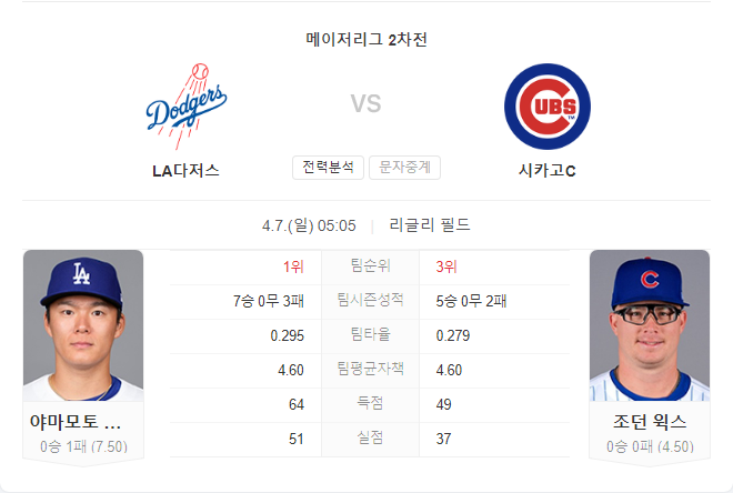 4월 7일 MLB 믈브 LA 다저스 VS 시카고 컵스 타카짱의 경기 예측 분석