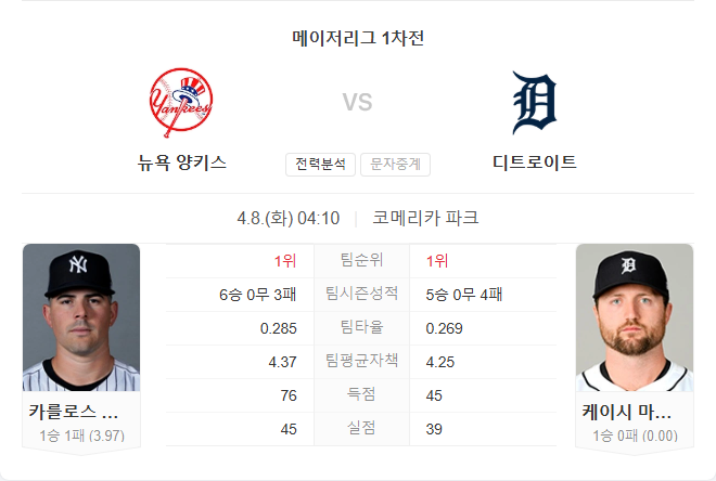 라일리 그린은 타율 .361, 8홈런으로 리그 최고의 장타력을 과시하고 있으며, 케리 카펜터는 8타점으로 팀 타점을 이끌고 있습니다. 선발 케이시 마이즈는 시즌 첫 등판에서 5.2이닝 무실점의 완벽한 투구를 선보였으며, 양키스 상대 통산 2경기 평균자책 5.23을 기록 중입니다.