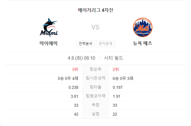 4월 8일 MLB 메이저리그 마이애미 말린스 VS 뉴욕 메츠 타카짱의 경기 예측 분석