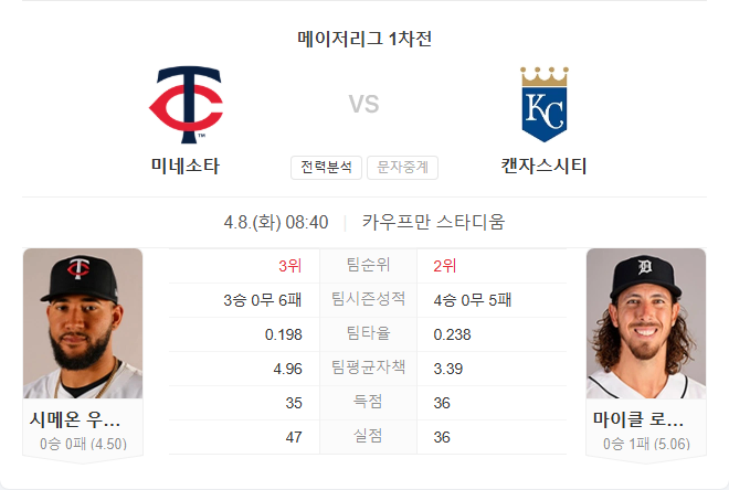 로열스는 시즌 4승 5패로 중부지구 중위권에 머무르고 있으며, 최근 볼티모어와의 홈 시리즈에서 2승 1패로 시즌 첫 시리즈 승리를 거뒀습니다. 일요일 경기에서는 경기 초반 2회까지 3점을 뽑으며 4-1 승리를 거두었고, 크리스 부빅이 6.2이닝 1실점 8탈삼진으로 호투하며 승리를 이끌었습니다. 이날 선발 마운드에는 마이클 로렌젠이 오릅니다.