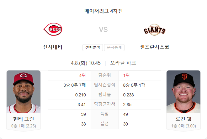 양 팀 모두 개막 시리즈에서 맞붙었던 선발 매치업이 재현되며 흥미를 더합니다. 헌터 그린은 구위는 훌륭하지만 불펜의 지원 부족과 타선의 침묵으로 인해 승리를 챙기지 못했고, 로건 웹은 안정적인 제구와 경험을 바탕으로 승리를 거두었습니다.