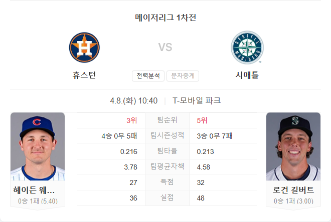 양 팀 모두 타선의 흐름은 불안정한 가운데, 선발 매치업에서는 시애틀이 약간의 우위를 점하고 있습니다. 로건 길버트는 꾸준한 제구와 이닝 소화력으로 안정감을 주는 반면, 웨스네스키는 이적 후 첫 시즌이라 불확실성이 존재합니다. 그러나 휴스턴은 알투베, 알바레즈 등 장타력을 갖춘 타선의 폭발 가능성이 있고, 최근 시리즈에서 반등의 조짐을 보였습니다.