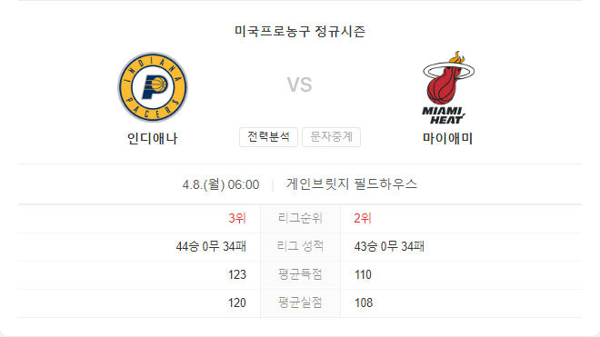 4월 8일 NBA 마이애미 히트 VS 인디애나 페이서스 타카짱의 경기 예측 분석