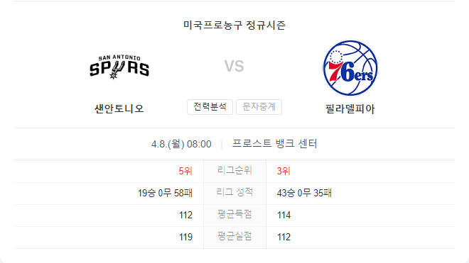 필라델피아 세븐티식서스와 샌안토니오 스퍼스의 이번 경기는 여러 변수가 있지만, 필라델피아가 샌안토니오를 상대로 유리한 위치에 있는 것으로 보입니다. 조엘 엠비드의 복귀는 필라델피아에게 큰 힘이 되고 있으며, 샌안토니오는 부상으로 인해 주요 선수들이 결장하는 어려움을 겪고 있습니다.