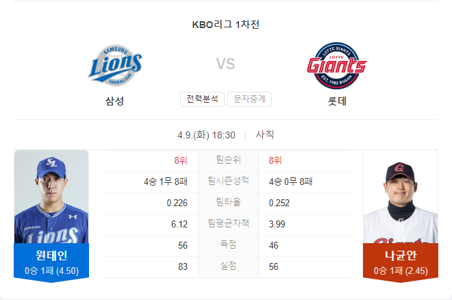 롯데 자이언츠는 나균안 투수가 선발로 나서며 삼성 라이온즈를 상대합니다. 나균안은 직전 한화전에서 6이닝 무실점의 호투를 펼치며 시즌 첫 승리를 기록했습니다.