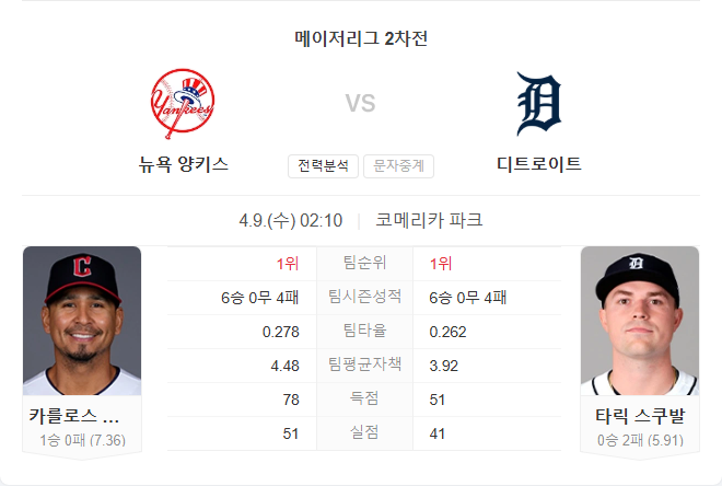 4월 9일 MLB 메이저리그 뉴욕 양키스 VS 디트로이트 타이거즈 타카짱의 경기 예측 분석