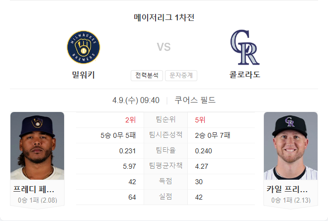 특히 콜로라도는 아직 연승이 없고, 시즌 내내 불안한 경기 운영을 보여주고 있어 홈 이점에도 불구하고 열세에 있습니다. 브루어스가 마운드와 타선의 균형을 바탕으로 접전 끝에 승리를 거둘 것으로 보입니다.