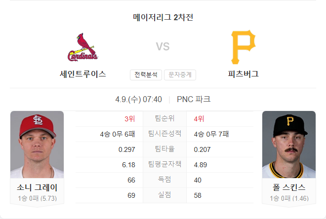 카디널스는 폭발적인 타격을 바탕으로 점수를 내고 있으나, 투수진의 붕괴로 인해 고전하고 있습니다. 반면 파이리츠는 안정적인 선발 스켄스를 앞세워 실점을 억제할 수 있겠지만, 빈약한 타선이 여전히 발목을 잡고 있습니다.