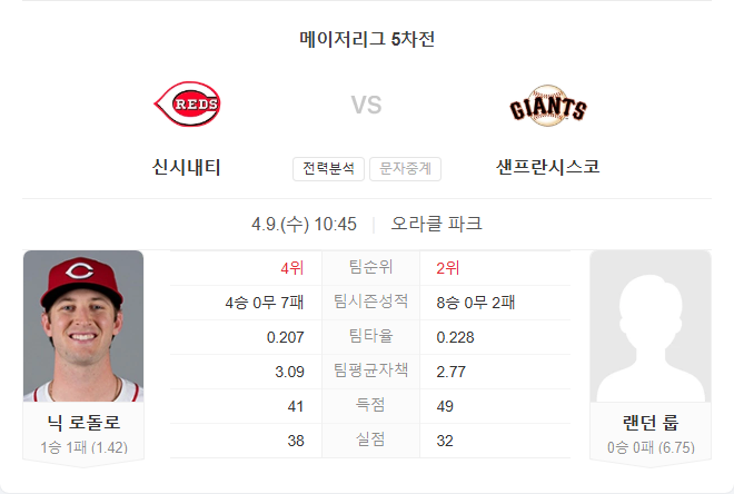 양 팀 선발 투수는 시즌 초반 안정적인 피칭을 보여주고 있으며, 팽팽한 투수전이 예상됩니다. 그러나 샌프란시스코는 최근 연승 행진과 홈 경기 이점을 갖고 있고, 타선의 집중력 면에서도 신시내티를 압도하고 있습니다.