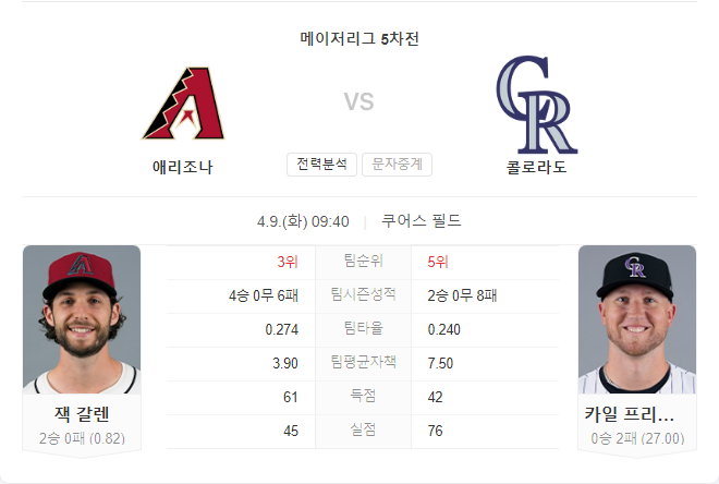 선발 투수로는 잭 갤런이 나섭니다. 그는 이번 시즌 2승 무패, 평균자책점 0.82를 기록하고 있습니다. 갤런은 지난 경기에서 양키스를 상대로 6이닝 동안 무실점 피칭을 하며 승리를 거두었습니다. 그는 콜로라도를 상대로 통산 7승 1패, 평균자책점 2.41을 기록하며 강한 모습을 보여왔습니다.