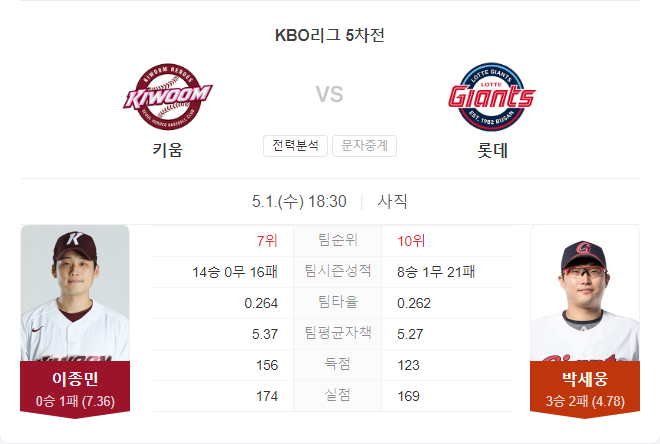 이번 경기는 롯데와 키움 모두 연패에서 벗어나기 위한 중요한 승부가 될 것입니다. 롯데의 홈에서의 강력한 타격과 박세웅의 호투가 기대되는 반면, 키움의 이종민은 아직 불안정한 모습을 보이고 있어 이를 극복해야 합니다. 롯데의 홈 경기 강점과 키움의 불펜 문제를 고려했을 때, 롯데가 이번 경기에서 우위를 점할 가능성이 높습니다.