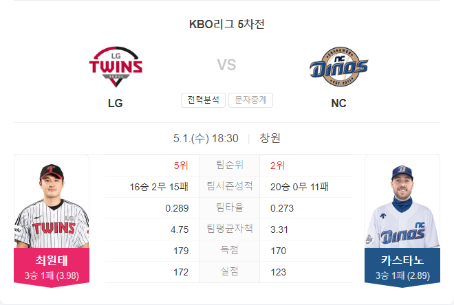 NC 다이노스는 다니엘 카스타노를 투수로 내세워 5연승을 노립니다. 최근 두산 원정에서는 5이닝 6실점으로 다소 부진했지만, 홈에서 강한 모습을 보여주고 있어 이번 경기에서의 반등을 기대하고 있습니다.