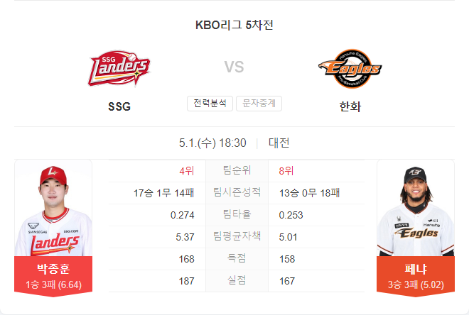 반면, 페냐는 홈에서 강점을 보여주었기 때문에, 이번 경기에서 반등을 기대해볼 수 있습니다. 전체적으로 한화가 승리에 조금 더 가까이 있는 것으로 보입니다.