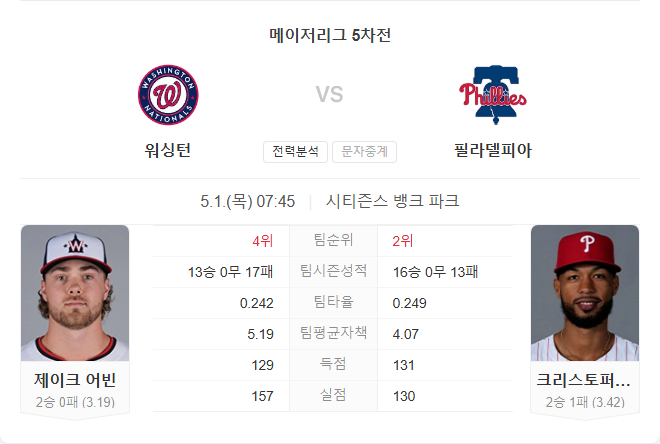 선발 제이크 어빈은 시즌 2승 무패, 평균자책점 3.19를 기록하고 있습니다. 최근 메츠전에서는 7.1이닝 1실점으로 호투하며 팀 승리를 이끌었으며, 최근 세 경기에서는 총 3실점만을 허용하며 안정적인 투구를 이어가고 있습니다. 다만 필라델피아 상대로는 통산 0승 3패, 평균자책점 5.57로 약한 모습을 보였습니다.