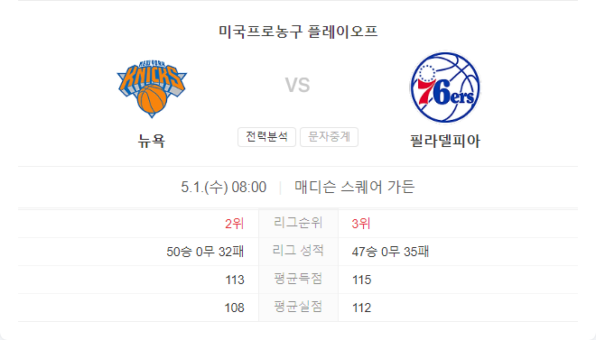 뉴욕 닉스가 홈 이점을 살려 필라델피아를 꺾고 시리즈를 마무리할 가능성이 높다. 필라델피아가 만약 반격에 성공한다 하더라도, 매우 치열한 접전이 될 것으로 보인다. 경기는 점수 차이가 크지 않을 것으로 예상된다.