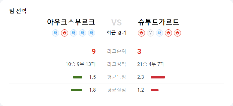 아우쿠스부르크가 최근 수비적으로 취약한 모습을 보여주고 있어, 공격적인 슈투트가르트에게 유리한 경기가 될 것으로 보입니다. 슈투트가르트가 상대의 약점을 노려 승리를 가져갈 가능성이 높으며, 높은 점수차로 승부가 결정될 수도 있습니다. 아우쿠스부르크는 이번 경기에서 방어적으로 안정을 찾기 위해 많은 노력이 필요할 것입니다.