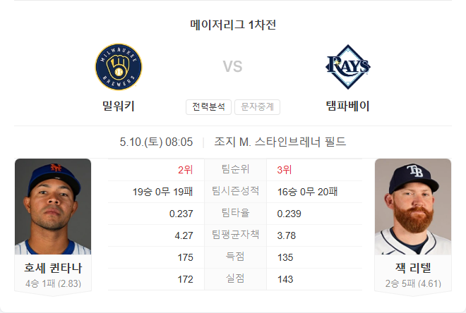 양 팀 모두 직전 경기에서 완패하며 분위기가 가라앉은 상태입니다. 킨타나는 안정된 경기 운영 능력을 보여주고 있으며, 리텔은 홈런 허용이 변수입니다. 원정 성적이 뛰어난 브루어스가 선발 싸움에서 우위를 점할 가능성이 높아 보입니다. 타격 침묵이 길어진 레이스는 이번 경기에서도 고전할 전망입니다.
