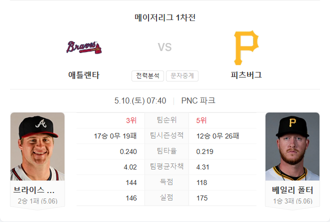 선발로 나서는 베일리 팔터는 시즌 7경기에서 1승 3패, 평균자책점 5.06을 기록 중입니다. 지난 경기에서는 샌디에이고를 상대로 7이닝 1실점의 호투를 펼쳤지만 팀이 2-1로 패하며 승패를 기록하지 못했습니다. 브레이브스를 상대로는 통산 5경기(선발 5경기)에 나서 2승 1패, 평균자책점 5.47을 기록했으며, PNC 파크에서는 통산 23경기(선발 21경기)에서 8승 6패, 평균자책점 4.02로 비교적 안정적인 모습을 보이고 있습니다.