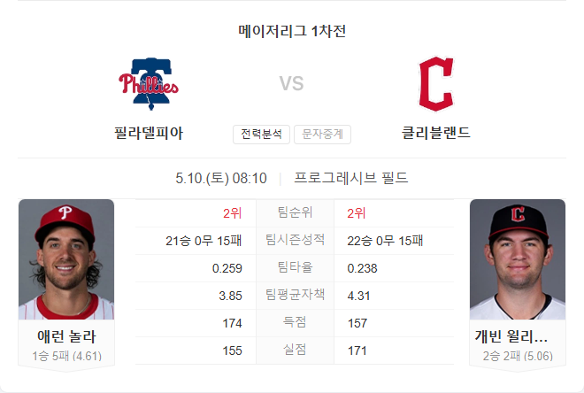 이번 경기는 아론 놀라가 선발 등판합니다. 그는 시즌 1승 5패, 평균자책점 4.61, WHIP 1.317을 기록 중이며, 최근 세 경기에서는 1승 1패, 평균자책점 2.33의 안정적인 흐름을 보이고 있습니다. 놀라는 2023년 7월 클리블랜드 원정에서 7이닝 3실점을 기록한 바 있어 경기장에 대한 익숙함도 장점으로 작용할 수 있습니다.