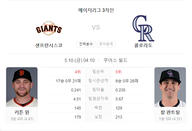 하지만 쿠언트릴이 안정적인 모습을 보인다면 콜로라도가 이번 경기에서 우위를 점할 수 있을 것입니다. 반면, 윈이 반등을 보이고 샌프란시스코 타선이 쿠언트릴을 공략한다면 게임은 뒤집힐 수 있습니다.