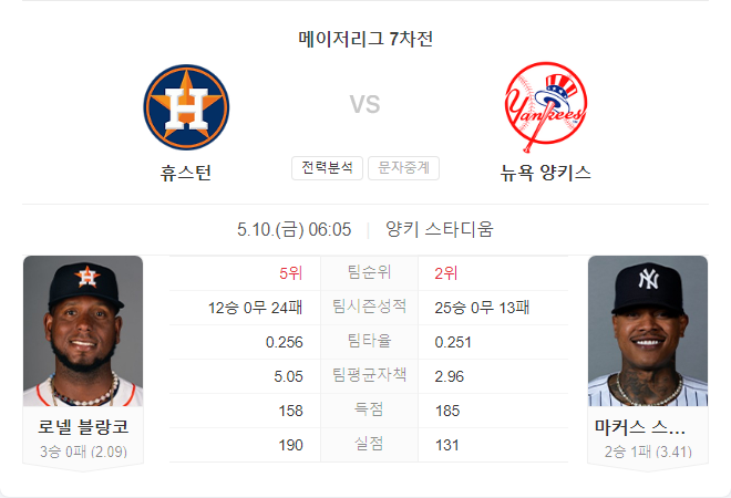 저스틴 벌랜더는 5이닝 동안 7실점을 하며 패전 투수가 되었습니다. 이번 경기에서 론엘 블랑코가 선발로 나서며, 올 시즌 3승 무패, 평균자책점 2.09를 기록 중입니다. 블랑코는 양키스를 상대로 처음 투구하며, 이번이 양키 스타디움에서의 첫 등판입니다.
