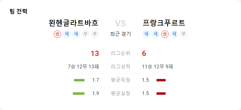 따라서 프랑크푸르트가 유리한 입장에서 경기를 풀어갈 것으로 보이며, 무승부 혹은 프랑크푸르트의 승리 가능성을 높게 볼 수 있습니다.