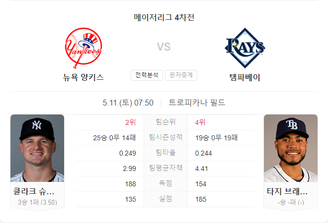 반면, 탬파베이 레이스는 최근의 상승세를 이어가기 위해 홈에서 강한 모습을 보여야 합니다. 하지만, 경험 많은 슈미트와 비교하여 시즌 첫 등판인 브래들리의 불확실성이 변수로 작용할 수 있습니다. 양키스의 타선이 최근 좋은 페이스를 보이고 있어, 이 경기에서는 뉴욕 양키스가 승리할 가능성이 높아 보입니다.