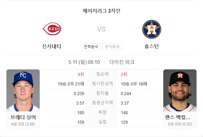 매컬러스는 레즈와의 통산 전적이 단 한 차례로 2016년 한 경기 등판에 그쳤고, 현재 레즈 타선 중 그를 상대한 경험이 있는 선수는 두 명뿐입니다. 투구 내용보다는 체력과 이닝 소화 능력이 이번 경기의 핵심 변수가 될 것입니다.