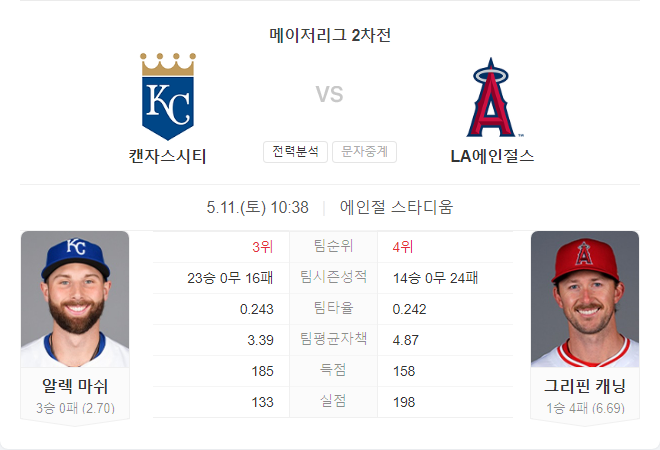 반면, 에인절스는 투수 문제를 해결하지 못하고 있으며, 로열스의 타선을 제어하기에는 어려움이 예상됩니다. 따라서 이번 경기에서 캔자스시티 로열스의 승리를 예상합니다.