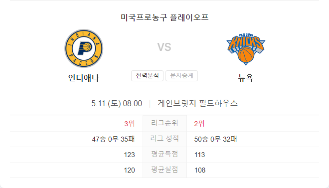 | 5월 9일 NBA 인디애나 페이서스 VS 뉴욕 닉스 타카짱의 경기 예측 분석 (0) | 2024.05.09 |