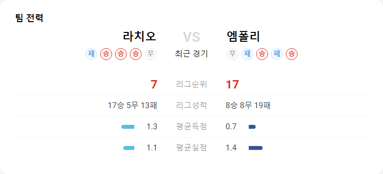 라치오의 현재 폼과 전술적 안정성은 엠폴리를 상대로 우위를 점할 수 있습니다. 라치오는 강화된 중앙 라인과 향상된 압박 능력을 바탕으로 경기를 주도할 가능성이 높습니다. 반면, 엠폴리는 수비적인 전술로 버티기에 집중할 것이지만, 라치오의 공세를 막아내기에는 한계가 있을 것으로 보입니다. 결국 라치오가 이 경기에서 승리할 가능성이 높은 상황입니다.