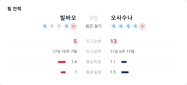 오사수나는 부디미르와 같은 핵심 공격 자원의 결장으로 공격 라인이 약화된 상태입니다. 그러나 안정적인 수비 전술을 통해 최근 경기에서 상대적으로 덜 득점력이 뛰어난 팀들을 상대로 안정감을 유지하려 노력하고 있습니다. 그러나 빌바오처럼 강한 압박과 동적인 움직임을 보이는 팀에게는 고전할 가능성이 높습니다.