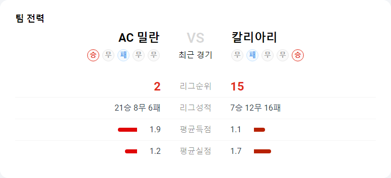 밀란이 홈에서 공격력을 발휘하여 경기를 지배할 가능성이 높으며, 칼리아리는 중원의 약점과 결장자의 영향으로 인해 밀란을 상대로 큰 위협을 가하기 어려울 것입니다. 이 경기는 AC 밀란이 승리할 가능성이 높은 경기로 예상됩니다.