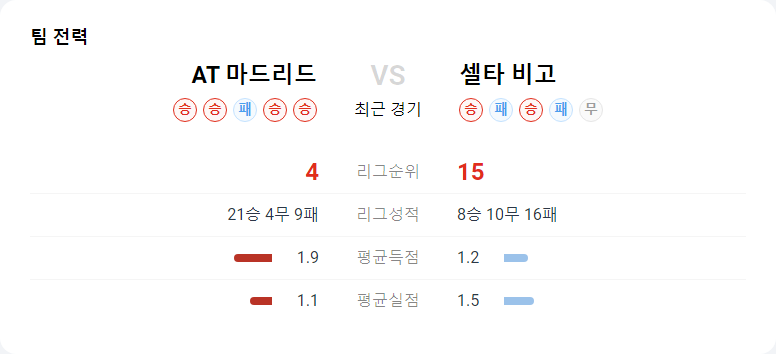 아틀레티코 마드리드는 셀타 비고를 상대로 전통적으로 강한 모습을 보여왔으며, 이번에도 그 전력 차이를 드러낼 것으로 보입니다. 팀의 압박 능력과 피지컬은 셀타 비고를 수세에 몰아넣기에 충분합니다. 그러나 결장자가 다수 발생한 상황은 경기 운영에 다소 영향을 줄 수 있으며, 특히 측면에서의 공격 전개가 약화될 수 있는 부분입니다.