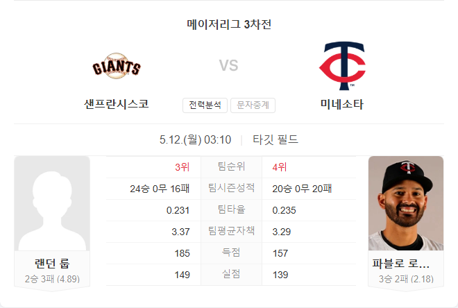 두 팀의 최근 흐름은 극명하게 갈립니다. 미네소타는 투수력과 공격 밸런스 모두에서 압도적인 흐름을 보이고 있고, 홈 경기에서의 강세도 뚜렷합니다. 반면 자이언츠는 타선 침묵과 수비 불안이 겹치며 시리즈 내내 고전 중입니다.