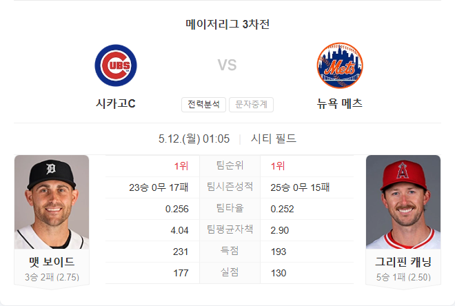 시카고 컵스는 22승 17패로 내셔널리그 중부지구 1위를 유지하고 있습니다. 최근 샌프란시스코와의 시리즈에서 마운드가 흔들리며 다소 부진했지만, 밀워키를 상대로 시리즈를 따내는 등 원정에서는 꾸준한 성과를 내고 있습니다. 이번 경기 선발은 좌완 베테랑 맷 보이드입니다. 보이드는 시즌 6경기에서 3승 2패, 평균자책점 2.75, WHIP 1.35를 기록 중입니다. 직전 등판에서는 자이언츠를 상대로 6이닝 2실점 호투를 펼치며 승리를 따냈습니다.