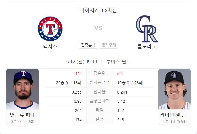 이번 경기에서 선발 투수로 나서는 앤드류 히니는 이번 시즌 아직 승리가 없으나 최근 경기에서 좋은 모습을 보이며 자신감을 회복하고 있습니다. 텍사스의 강력한 타선이 콜로라도의 약한 투수진을 상대로 큰 이점을 가질 것입니다.