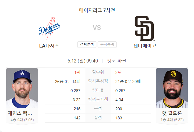 5월 12일 MLB LA 다저스 VS 샌디에이고 파드리스 타카짱의 경기 예측 분석