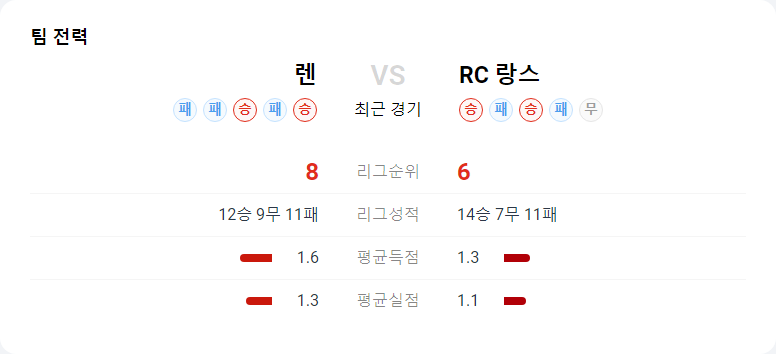 랑스는 리그 6위에 위치해 있으며, 압박 능력에서 뛰어난 모습을 보이고 있습니다. UCL에서 아스날을 상대로도 좋은 모습을 보여준 바 있으며, 렌을 상대로도 이러한 강한 압박으로 우위를 점할 가능성이 있습니다.