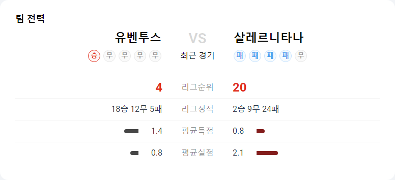 중원에서의 기복은 있지만, 살레르니타나와 같은 하위 팀을 상대로는 비교적 안정적인 성과를 내고 있습니다. 다만, 중요한 선수들의 결장이 이 경기의 변수가 될 수 있습니다.